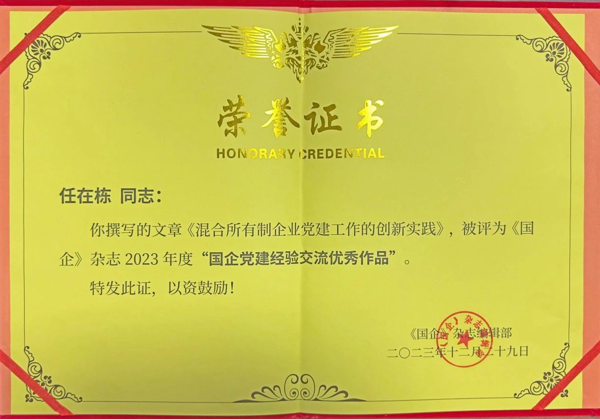 近日,《國(guó)企》雜志編輯部對(duì)2023年度《國(guó)企》雜志所刊載的文章按黨建理論研究、工作研究、經(jīng)驗(yàn)交流、宣傳報(bào)道4大類(lèi)進(jìn)行了評(píng)審,依據(jù)文章選題、撰稿規(guī)范、文章質(zhì)量、影響力等評(píng)審要素,評(píng)選出2023年度全國(guó)優(yōu)秀作品。公司黨委書(shū)記、董事長(zhǎng)任在棟署名文章《混合所有制企業(yè)黨建工作的創(chuàng)新實(shí)踐》被評(píng)為2023年度“國(guó)企黨建經(jīng)驗(yàn)交流優(yōu)秀作...