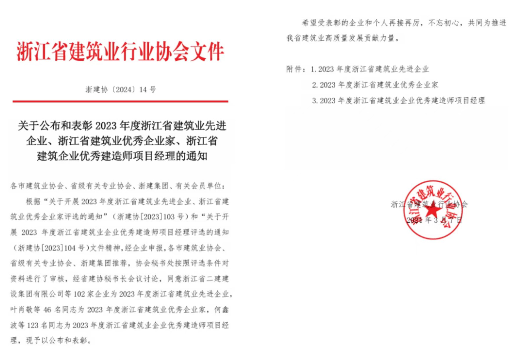 近日,浙江省建筑業(yè)行業(yè)協(xié)會(huì)發(fā)布《關(guān)于公布和表彰2023年度浙江省建筑業(yè)先進(jìn)企業(yè)、浙江省建筑業(yè)優(yōu)秀企業(yè)家、浙江省建筑企業(yè)優(yōu)秀建造師項(xiàng)目經(jīng)理的通知》。中化學(xué)曙光建設(shè)有限公司榮獲2023年度浙江省建筑業(yè)先進(jìn)企業(yè),陳大路榮獲浙江省建筑企業(yè)優(yōu)秀建造師項(xiàng)目經(jīng)理。2023年度浙江省建筑業(yè)先進(jìn)企業(yè)2023年度浙江省建筑業(yè)企業(yè)優(yōu)秀建造師...